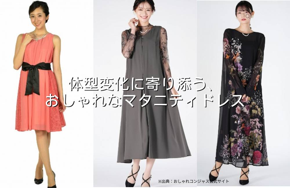 伸びる素材・ウエストゴムのドレスも揃っており、妊娠中期〜後期まで対応しやすい点が安心です。